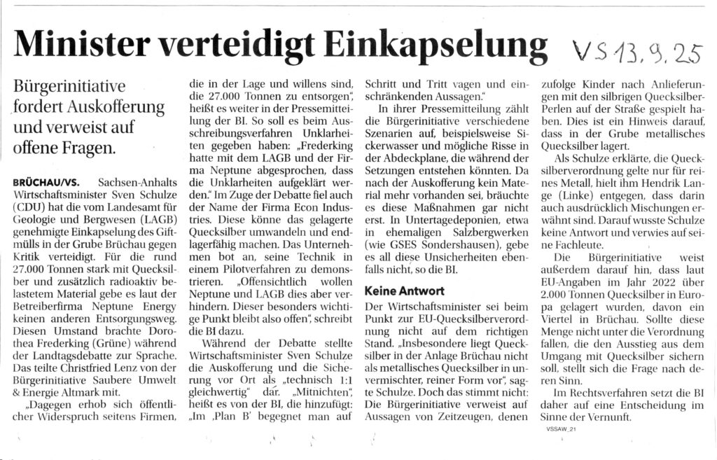 - Wirtschaftsminister verteidigt Einkapselung (Zeitungsausschnitt Volksstimme 13.09.2025)