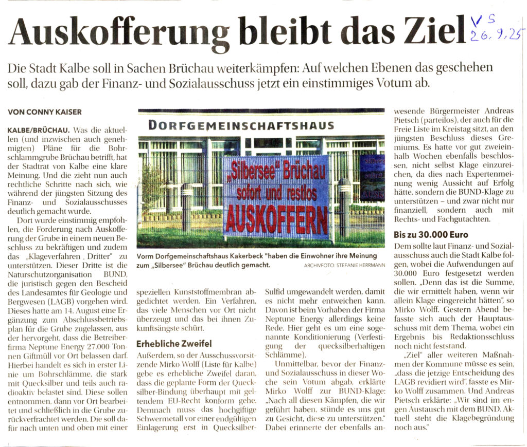 Die Salzwedeler Volksstimme hatte am 31.07.2025 berichtet, dass laut Behauptung von Neptune Energy in der Ausschreibung der für die Auskofferung der Brüchauer Grube nötigen Entsorgungsleistungen kein genehmigungsfähiges Angebot für die Entsorgung von 27.000 Tonnen mit Quecksilber und NORM belastetes Material eingegangen sei.